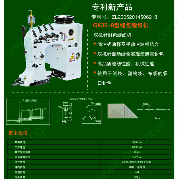 采用雙機(jī)針縫合,一次縫兩趟線,牢固可靠,可實(shí)現(xiàn)無(wú)泄漏封包,適合于對(duì)縫口有嚴(yán)格要求的廠家對(duì)紙袋、塑編袋、布袋等的封包縫口。該縫包機(jī)采用腳踏開關(guān)人工控制啟停機(jī)、內(nèi)藏式切刀機(jī)械剪線,操作簡(jiǎn)單,使用方便。
