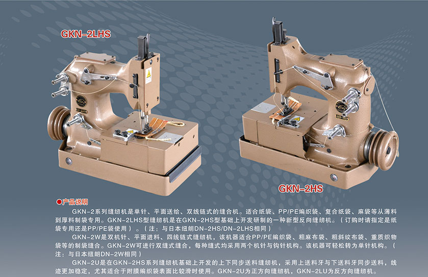 GKN-2 High speed bag sewing machine: Plain Feed, Flat Bed, Double Thread Chain Stitch Machine for seaming and hemming of light to medium weight material such as multi-wall paper, PP/PE woven cloth, jute bags, etc.