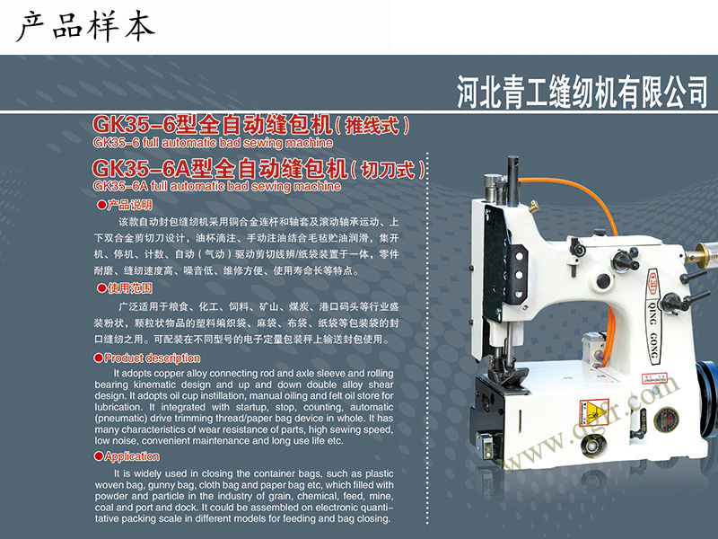 c.GK35-6AF型反方向自動(dòng)縫包機(jī),在GK35-6A自動(dòng)縫包機(jī)基礎(chǔ)上開發(fā)的一種新型反方向縫包機(jī)。該機(jī)可以與GK35-6A型正機(jī)相配合,在同一立柱上在兩側(cè)同時(shí)縫合袋口。