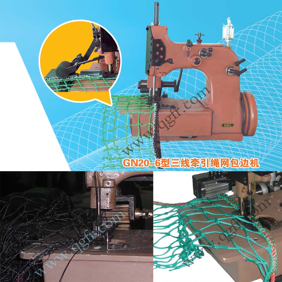 GN20-6網(wǎng)繩包邊機, 是專門用于將繩索與體育用網(wǎng)、漁網(wǎng)、安全網(wǎng)、及農(nóng)業(yè)用網(wǎng)等的網(wǎng)片鏈接在一起的重型包邊機。 該機具備同步牽引功能,送料輥與機器的縫合動作保持同步,從而確保間距、縫式的一致性以及繩索連接的可靠性,對于繩索和網(wǎng)的導(dǎo)入均提供了專門的指導(dǎo),便于操作者將繩索和網(wǎng)片連接起來,并不會出現(xiàn)跳針現(xiàn)象。單針,三線。