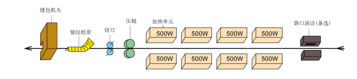 袋口清潔(備選)→切刀:修整袋口→內(nèi)袋熱封(4組加熱塊加熱:聚四氟乙烯封口帶使加熱塊與袋子不直接接觸,以保護(hù)袋子外表不與加熱塊粘連)→壓輥壓合→皺紋紙帶→縫包機(jī):外袋縫紉.