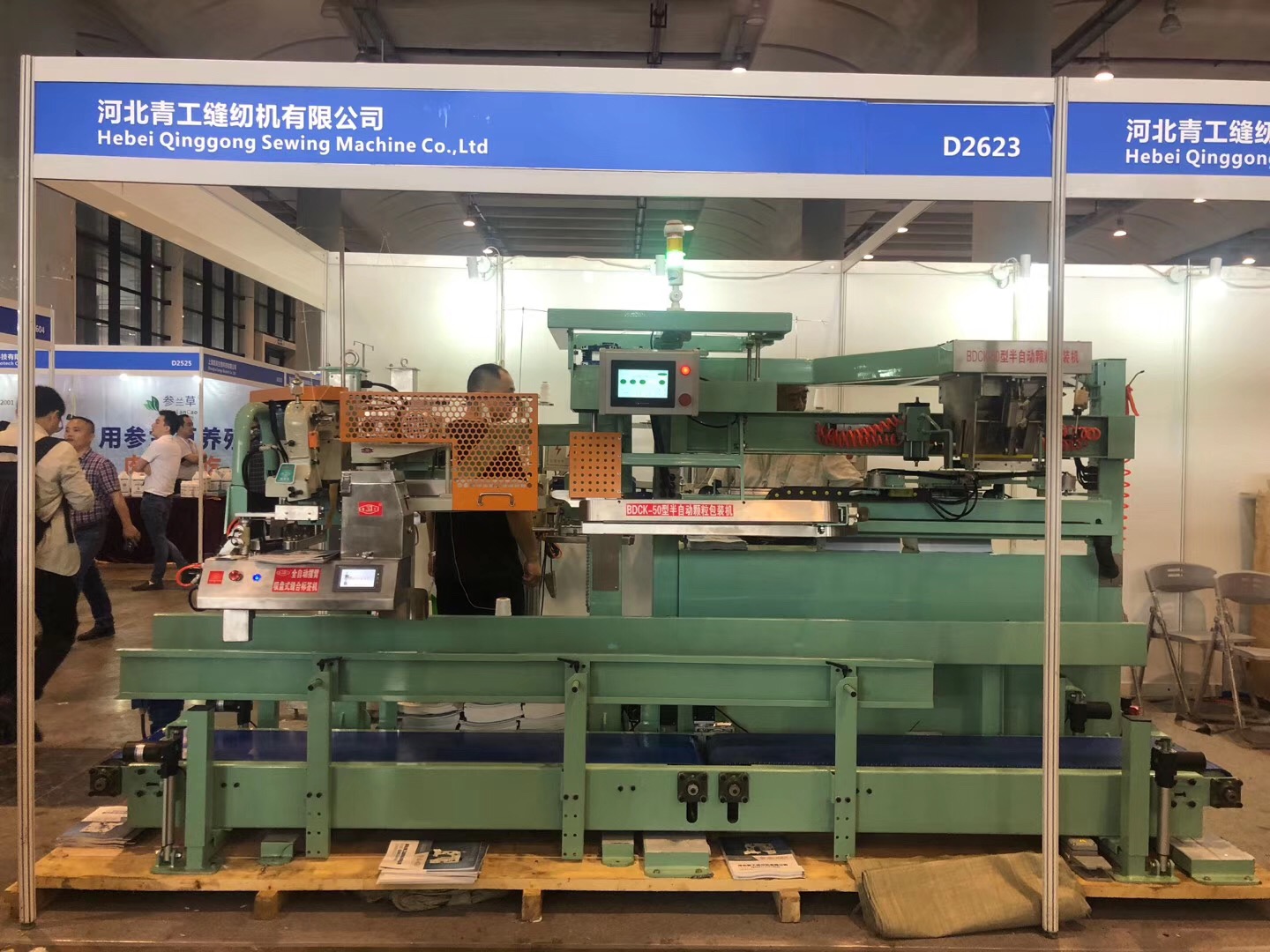 本機適合灌裝包裝袋袋口寬度為400-650毫米、高度為550-1050毫米的顆粒、粗粉狀物品的自動化包裝。自動完成開口加壓、袋夾緊、袋封口、輸送,折邊、送標簽、縫包等動作,省人工,效率高,操作簡單,性能可靠,是對自動化水平要求較高的廠家完成編織袋、紙塑復合袋等袋口縫合作業(yè)的關鍵設備。